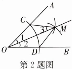 ②分别以点C,D为圆心,以大于$\frac{1}{2}CD$的长为半径作弧,两弧在∠AOB内交于点M;