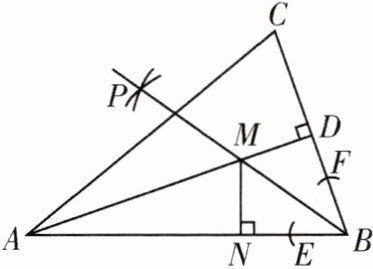 13. 【模型观念】[2024湖南]如图,在锐角三角形ABC中,AD是边BC上的高,在BA,BC上分别截取线段BE,BF,使BE=BF;分别以点E,F为圆心,大于$\frac{1}{2}EF$的长为半径画弧,在∠ABC内,两弧交于点P,作射线BP,交AD于点M,过点M作MN⊥AB于点N.若MN=2,AD=4MD,则AM=