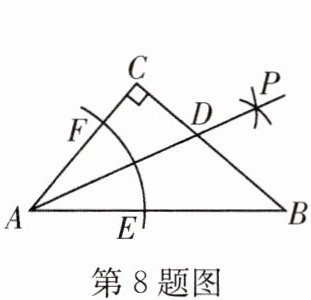 8. [2024天津]如图,在Rt△ABC中,∠C=90°,∠B=40°,以点A为圆心,适当长为半径画弧,交AB于点E,交AC于点F;再分别以点E,F为圆心,大于$\frac{1}{2}EF$的长为半径画弧,两弧在∠BAC的内部相交于点P;画射线AP,与BC相交于点D,则∠ADC的度数为 (