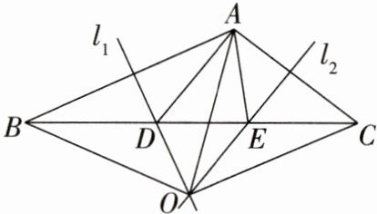 12. 【推理能力】如图,在 $\triangle ABC$ 中,边 $AB$ 的垂直平分线 $l_{1}$ 交 $BC$ 于点 $D$,边 $AC$ 的垂直平分线 $l_{2}$ 交 $BC$ 于点 $E$,$l_{1}$ 与 $l_{2}$ 相交于点 $O$,$\triangle ADE$ 的周长为 $6\ cm$。