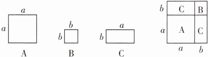 11. [2023 随州]设有边长分别为$a$和$b(a > b)$的 A 类和 B 类正方形纸片,长为$a$、宽为$b$的 C 类矩形纸片若干张.如图所示要拼一个边长为$a + b$的正方形,需要 1 张 A 类纸片、1 张 B 类纸片和 2 张 C 类纸片.若要拼一个长为$3a + b$、宽为$2a + 2b$的矩形,则需要 C 类纸片的张数为(