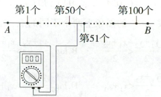 9. (2025 湖南长沙月考)一块电路板的$AB$线路上有 100 个串联的焊接点,若知道电路不通的原因是焊接点脱落,要想借助万用表,利用二分法的思想检测出是第几个焊接点脱落,则最多需要检测