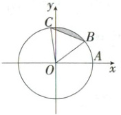 故$S_{扇形BOC} = \frac{1}{2}\theta r^{2} = \frac{1}{2} × \frac{\pi}{3} × 1^{2} = \frac{\pi}{6}$,易知$\triangle BOC$为等边三角形,所以$S_{\triangle BOC} = \frac{1}{2} × 1 × \sqrt{1 - (\frac{1}{2})^{2}} = \frac{\sqrt{3}}{4}$,