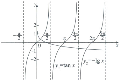 当x>0时,令y₁=tan x,y₂=-lg x,则此时g(x)的零点个数为y₁=tan x与y₂=-lg x的图象的交点个数,如图,