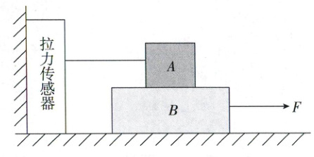 15. (16 分)如图所示,$A$、$B$ 两个质量均为 $m$ 的物体叠放在水平面上,$B$ 物体的上下表面均水平,$A$ 物体与一拉力传感器相连接,连接拉力传感器和物体 $A$ 的细绳保持水平。从 $t = 0$ 时刻起,用一水平向右且 $F = kt$($k$ 为常量)的力作用在 $B$ 物体上,且最大静摩擦力等于滑动摩擦力。$A$ 与 $B$、$B$ 与水平面间的动摩擦因数均为 $\mu$,重力加速度为 $g$。