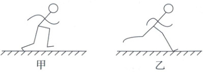 3. 在中学秋季田径运动会上,高一 2 班李好同学奋力拼搏,勇夺男子 100 m 冠军,如图所示为该同学奔跑途中的两个瞬间,用 $ F_{f1} $、$ F_{f2} $ 分别表示该同学在图甲、乙两瞬间所受到的摩擦力,则关于 $ F_{f1} $、$ F_{f2} $ 的方向,以下说法正确的是( )