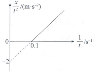 10. BD 本题主要考查非常规图像问题 根据匀变速直线运动公式$x = v_0t + \frac{1}{2}at^2$,变形可得$\frac{x}{t^2} = v_0 · \frac{1}{t} + \frac{1}{2}a$,可知机动车的初速度等于$\frac{x}{t^2}$图像的斜率,即$v_0 = \frac{2}{0.1}\ m/s = 20\ m/s$,纵轴截距$-2\ m/s^2 = \frac{1}{2}a$,解得$a = -4\ m/s^2$,故机动车处于匀减速状态,加速度大小为$4\ m/s^2$,A、C 错误,B 正确;机动车做匀减速运动的总时间$t = \frac{0 - v_0}{a} = 5\ s$,则机动车在前$4\ s$的位移$x = v_0t' + \frac{1}{2}at'^2 = 48\ m$,D 正确。
