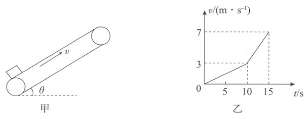5. 许多工厂的流水线上安装有用于传送工件的传送带,以提高工作效率。如图甲所示,倾角为$\theta = 37^{\circ}$的倾斜传送带沿顺时针方向转动,传送带的速度v随时间t的变化图像如图乙所示。$t = 0$时刻将质量为$m = 1kg$的煤块轻放在传送带底端,已知煤块和传送带间的动摩擦因数$\mu = 0.8$,最大静摩擦力等于滑动摩擦力,传送带足够长,取重力加速度$g = 10m/s^{2}$,$\sin37^{\circ} = 0.6$,$\cos37^{\circ} = 0.8$。0~15s过程中煤块在传送带上划出的痕迹的长度为( )