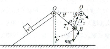 分析图中各夹角的几何关系,有$\alpha = 90^{\circ} - \theta$,$\beta = \frac{\theta}{2}$,根据正弦定理有$\frac{mg}{\sin(180^{\circ} - \alpha - \beta)} = \frac{T_1}{\sin\beta} = \frac{T_2}{\sin\alpha}$,即$\frac{mg}{\cos\frac{\theta}{2}} = \frac{T_1}{\sin\frac{\theta}{2}} = \frac{T_2}{\sin\alpha}$,所以$T_2 = \frac{\cos\theta}{\cos\frac{\theta}{2}}· mg=(2\cos\frac{\theta}{2}·\frac{\cos\theta}{\cos\frac{\theta}{2}})mg$,$T_1 = mg\tan\frac{\theta}{2}$,物体B由P点运动到Q点的过程中$\theta$减小,则$T_2$一直变大,$T_1$一直减小,A错误,B正确;由于物体B缓慢运动,即合外力为零,所以轻绳1和轻绳2对物体B的拉力的合力始终与物体B的重力等大反向,C错误;由于一开始物体A所受静摩擦力方向不确定,所以物体A受到斜面的摩擦力不一定是先减小后增大,D错误。