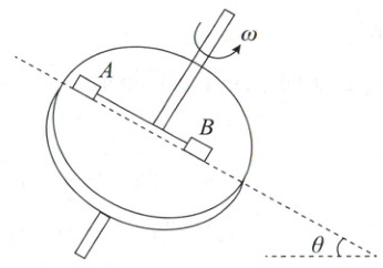 10. 如图所示,倾斜圆盘圆心处固定有与盘面垂直的细轴,盘面上沿同一直径放有质量均为m的A、B两物块(可视为质点),两物块分别用两根平行于圆盘的不可伸长的轻绳与轴相连,A、B两物块与轴的距离分别为2d和d,两物块与盘面的动摩擦因数$\mu$相同,盘面与水平面的夹角为$\theta$。当圆盘以角速度$\omega$匀速转动时,物块A、B始终与圆盘保持相对静止,且当物块A转到最高点时,A所受轻绳拉力刚好减小到零而B所受的摩擦力刚好增大到最大静摩擦力。已知重力加速度为g,最大静摩擦力等于滑动摩擦力。下列说法正确的是
