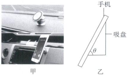 13. (10分)人们在日常生活中开车出行常用手机导航,如图甲所示是一种车载磁吸手机支架,手机放上去会被牢牢吸附。图乙是其侧视图,若手机质量$m = 0.2kg$,支架斜面的倾角$\theta = 53^{\circ}$($sin53^{\circ}=0.8$,$cos53^{\circ}=0.6$),手机与支架接触面间的动摩擦因数$\mu = 0.3$。设最大静摩擦力与滑动摩擦力大小相等,重力加速度g取10m/s²。在汽车做匀速直线运动的过程中: