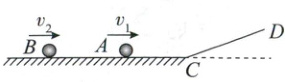 15. (14 分)如图所示,光滑水平面与固定的足够长的光滑斜面 CD 在 C 点平滑连接,可视为质点的小球 A、B 在光滑水平面上分别以 v₁ = 4 m/s 和 v₂ = 2 m/s 的速度向右匀速运动,两球先后滑上斜面,当 A 球沿斜面向上运动的速度为零时,B 球沿斜面向上运动的速度也刚好为零。已知两球在斜面上运动的加速度大小始终为 a = 5 m/s²,方向沿斜面向下,两球通过 C 点前后的速度大小不变,两球在斜面上速度为零后立即沿斜面向下做匀加速运动。求: