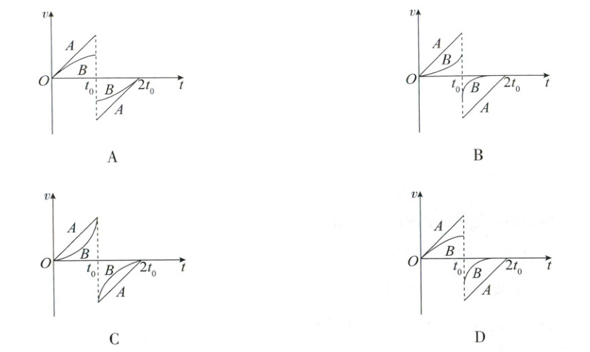 6. 将 $ A $、$ B $ 两小球同一时刻从不同的高度由静止释放,$ A $ 球所受空气阻力可忽略,$ B $ 球所受空气阻力的大小与 $ B $ 球的速率成正比,两小球在同一时刻落到水平地面,落地瞬间均以原速率反弹,规定竖直向下为正方向,下列关于两小球的速度 $ v $ 与时间 $ t $ 的图像中可能正确的是( )