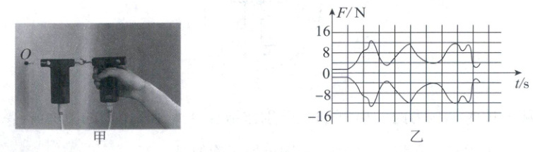 3. 如图甲所示,把两个互相钩着的力传感器同时连在计算机上,其中一个系在墙壁上的固定点O,另一个握在手中。图乙中两条图线分别表示两个力传感器受力的情况,下列说法正确的是( )