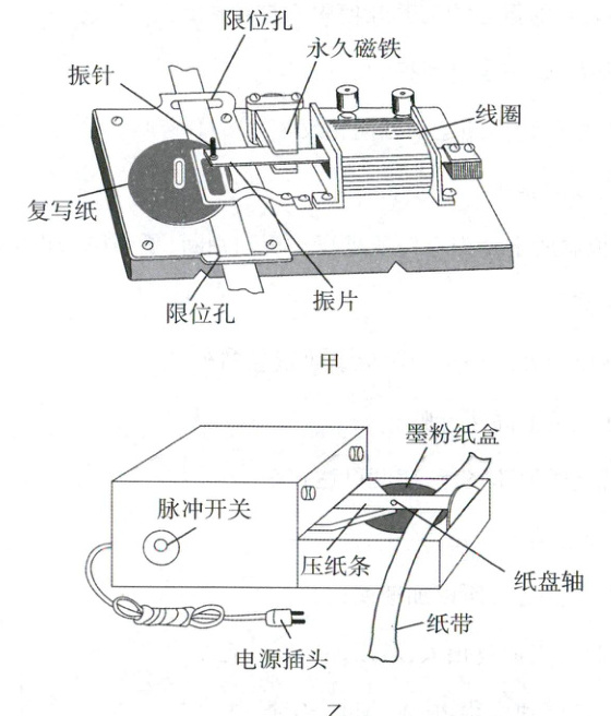 (1)甲是______(填“电磁”或“电火花”)打点计时器,电源采用的是______(填“交流 8 V”“交流 220 V”或“四节干电池”)。乙是______(填“电磁”或“电火花”)打点计时器,电源采用的是______(填“交流 8 V”“交流 220 V”或“四节干电池”)。