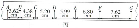 (2)某同学在“探究小车速度随时间变化的规律”的实验中,用打点计时器记录了被小车拖动的纸带的运动情况,在纸带上确定出 $A$、$B$、$C$、$D$、$E$、$F$、$G$ 共 7 个计数点,其相邻计数点间的距离如图丙所示,每两个相邻的计数点之间还有 4 个点未画出,电源频率为 50 Hz。