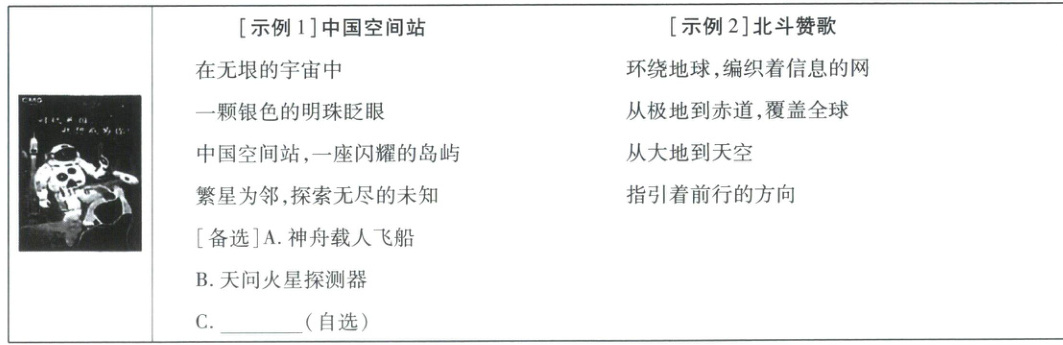 4 【参考答案及评分标准】(4分) 示例一 神舟载人飞船 你是一枚银剑刺破云障 用科学定律在太空书写华夏诗篇 那飞天壁画上神异的光圈 正闪烁在宇航员的指尖 示例二 天问火星探测器 将甲骨龟裂的幻想成真 带着《天问》的古老韵脚 在红色荒漠按下中国印—— 一枚必将发芽的青铜火种 【解析】本题考查诗歌创作。题干要求写一首赞歌致敬航天英雄,这意味着创作内容要围绕航天英雄展开,表达对他们的赞美、敬意等情感。结合示例可知,创作时可以采用比喻、拟人等修辞手法,生动形象地展现航天英雄或相关航天器。