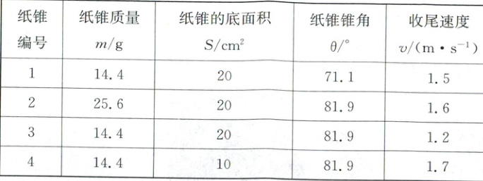 同学们用相同的复印纸制成了多个不同的纸锥,每次从相同高度由静止释放,分别测量出每个纸锥下落的收尾速度,并记录在表中。