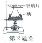 2. 如图所示,把少量碘放入锥形瓶中,瓶口加盖玻璃片。微微加热,瓶中充满紫色的碘蒸气,此过程碘发生的物态变化是
