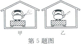 5. 如图所示,两个相同的水壶内装有同样多的水,此时都已沸腾。已知炉火的强度和房间内空气的湿度都相同,因此,可以判断出房间甲的气温