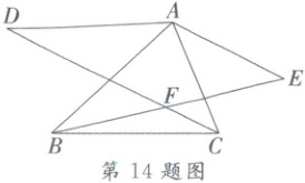 14. 如图,$D$,$E$是$\triangle ABC$外两点,连接$AD$,$AE$,有$AB = AD$,$AC = AE$,$\angle BAD = \angle CAE = \alpha$. 连接$CD$,$BE$交于点$F$.
