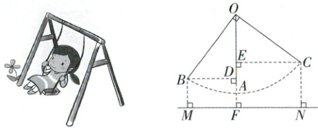 20. 【真实生活情境·荡秋千】小丽与爸爸、妈妈在公园里荡秋千.如图,小丽坐在秋千的起始位置 $ A $ 处, $ OA $ 与地面 $ MN $ 垂直, $ OA $ 延长线交 $ MN $ 于点 $ F $.她两脚在地面上用力一蹬,妈妈在 $ B $ 处接住她后用力一推,爸爸在 $ C $ 处接住她.已知点 $ B $ 距地面的高度 $ BM = DF = 1 m $,点 $ B $, $ C $ 到 $ OA $ 的水平距离 $ BD $, $ CE $ 分别为 $ 1.4 m $ 和 $ 1.8 m $, $ \angle BOC = 90° $,点 $ C $ 距地面的高度 $ CN = EF $,求此时 $ CN $ 的长.