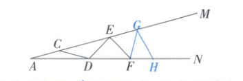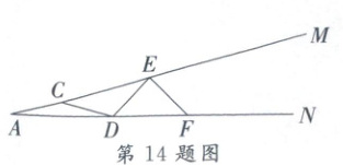 14. 如图,$ \angle MAN $ 是一个钢架,$ \angle MAN = 15^{\circ} $,为使钢架更牢固,需在其内部焊接一些钢管,如 $ CD $,$ DE $,$ EF $,…,若焊接的钢管的长度都与 $ AC $ 的长度相等,则: