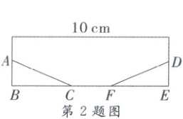 2.【中华优秀传统文化·徽派建筑】芜湖古城内的建筑多为徽派建筑,这种建筑风格以其独特的榫卯结构而闻名.榫卯结构是我国古代建筑、家具及其他木制器械的主要结构方式.如图所示,将两块全等的木楔($\triangle ABC\cong \triangle DEF$)水平钉入长为 10 cm 的长方形木条中(点 B,C,F,E 在同一条直线上).若$CF=2cm$,则木楔 BC 的长为(