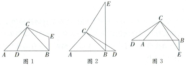 (2) 猜想论证:当点 $D$ 在直线 $AB$ 上运动时,如图 2,点 $D$ 在射线 $AB$ 上,请判断线段 $BD$,$AB$,$EB$ 的数量关系并证明;