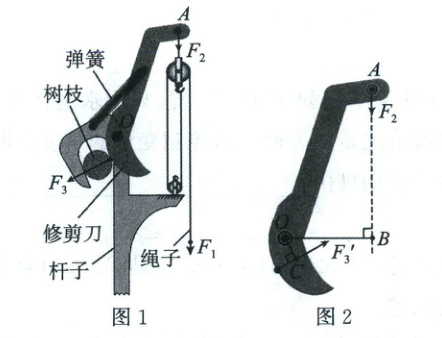 (3)某时刻,弹簧处于原长,若修剪刀的刀口对树枝施加的力 $F_{3}$ 为 $960$ 牛,$F_{3}'$ 是树枝对刀口的力(如图 2),此时绳子端需施加的力 $F_{1}$ 为多大?(已知 $OB=8$ 厘米,$OC=2$ 厘米,滑轮中各股绳子视为平行,工具自重和摩擦忽略不计)