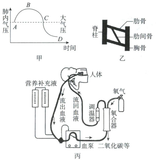 28. (6 分)深呼吸能够缓解人的紧张情绪。图甲曲线表示人体呼吸过程中某阶段的肺内气压变化;图乙为模拟呼吸过程中肋间肌的舒缩引起有关骨运动的模型;ECMO(体外膜肺氧合)是一种人工心肺机,主要用于为重症心肺功能衰竭患者提供持续的体外氧合与循环支持(如图丙所示)。回答下列问题: