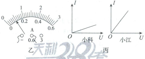 。(4)完成实验后,老师让同学们根据各自测得的数据绘制 I - U 图像,图丙为小科和小江绘制的 I - U 图像。导致他们绘制的图像不同的原因可能是