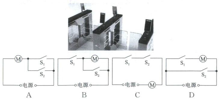 5. 校园安全至关重要,因此各校在入口处安装了门禁系统,如图所示。现要设计一款门禁系统,要求师生刷卡(相当于闭合$S_1$)或者人脸识别成功时(相当于闭合$S_2$),电动机启动,闸门打开放行。如图所示电路设计中符合上述要求的是(