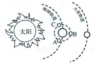 。(2)当火星在如图位置,地球上出现“月掩火星”的天文现象时,月球的大致位置在