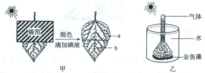 (填字母)部位变蓝色,说明植物光合作用需要阳光。(2)取一定量的金鱼藻置于水中,将装置放在阳光下一段时间后(如图乙所示),试管中收集到的气体主要是