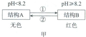 28. (8分)物质的结构决定物质的性质。无色酚酞遇碱会变红色,这是因为当环境的pH大于或等于8.2,酚酞分子的结构会发生改变。若分别用A、B表示酚酞在不同酸碱度环境中的结构,可建构如图甲的模型。