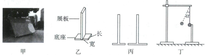 【验证猜想】他们制订了如下探究方案:制作两个展板相同、底座长度相同但宽度不同的模型,底座质量不计,如图丙所示。用悬挂于铁架台上的铁球撞击展板,模拟外界对展板的作用,记录观察到的现象并进行分析。