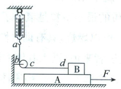 26. (6分)用如图所示的实验装置可以方便测量物体相对运动时摩擦力的大小。木板A放在水平地面上,木块B放置在水平的木板A上,细绳跨过定滑轮,一端与木块B相连,另一端与上端固定的弹簧测力计的秤钩相连,且细绳的ab段保持竖直,cd段保持水平。(木板A足够长,不计细绳重力和滑轮摩擦)