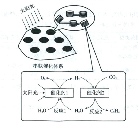 7. 乙烯(C₂H₄)是重要的化工原料。我国科学家根据植物光合作用原理,研制出类叶绿素结构的“串联催化体系”,可以在太阳光和催化剂作用下分解水,再联合CO₂制C₂H₄,如图所示。