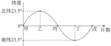 12. 如图为太阳直射点的纬度年变化曲线图,图中甲为春分日。若小满节气在 5 月 20 日,这一天位于图中(