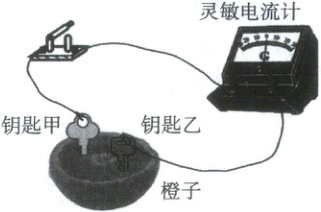 11. 用导线将开关、灵敏电流计和材质不同的钥匙甲、乙相连,将两钥匙插入橙子中(如图)。闭合开关,灵敏电流计指针发生偏转。下列推测一定正确的是(
