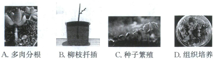 3.C [解析]植物的繁殖方式 多肉分根、柳枝扦插、组织培养都没有经过两性生殖细胞的结合,是由母体直接产生新个体的生殖方式,属于无性生殖[关键点],A、B、D 不符合题意;种子繁殖经过两性生殖细胞结合形成受精卵,再由受精卵发育成新个体,属于有性生殖,C符合题意。