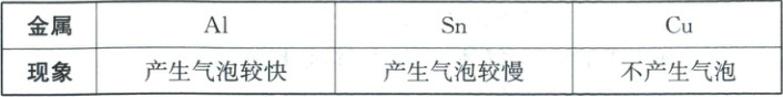 9. 为了比较 Al、Sn、Cu 的活动性顺序,在相同温度下,取大小相同的上述三种金属薄片,分别放入等质量等浓度的足量稀盐酸中,观察现象如表,下列说法正确的是(