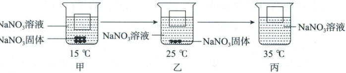 17. (6 分)在$15^{\circ}C$时,将一塑料方块放在$NaNO_{3}$溶液中,然后将溶液加热至$25^{\circ}C$和$35^{\circ}C$(不考虑水分蒸发),如图甲、乙、丙所示。