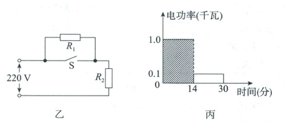 (3)由题图丙可知,横坐标表示加热时间,纵坐标表示电功率,由$W = Pt$可知,阴影部分面积表示电压力锅加热14min消耗的电能$W = Pt = 1000W × 14 × 60s = 8.4 × 10^5J$ (2分)