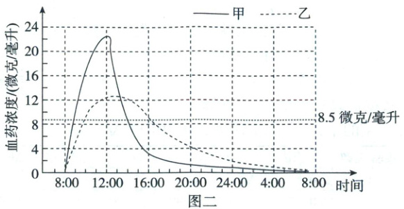 (填序号)。(3)为研究如何科学用药,甲组服用布洛芬片剂,乙组服用相同剂量的布洛芬缓释胶囊,两组均于上午 8:00 服药并定时静脉抽血,测得平均血药浓度如图二。小明在运动中拉伤导致肌肉疼痛,医生建议他服用布洛芬缓释胶囊而非布洛芬片剂,试推测医生建议的理由:
