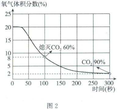 。(3)在收集二氧化碳过程中,某同学进一步探究了集气瓶内氧气体积分数对瓶口小木条燃烧情况的影响。多次实验后发现氧气体积分数降到 $8\%$ 左右时小木条熄灭。其中一组实验数据如图 2,在该实验条件下,要使二氧化碳体积分数达到 $90\%$,需在小木条熄灭后,再收集