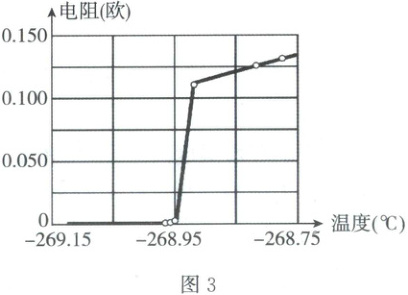 (3)①该金属的电阻随温度降低而减小,在−268.95 ℃时,电阻变成了 0 (2 分) ②输电线 (2 分)