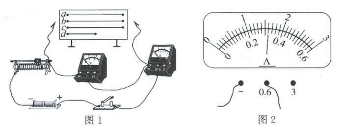 (1)将电阻丝 $a$ 的两端接入电路,闭合开关后,电流表指针位置如图 2 所示,其示数为