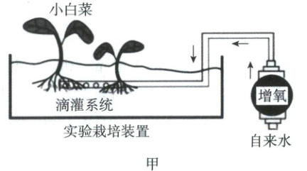 23. (8 分)灌溉水中含氧量是否会影响蔬菜产量呢?小科采用了如图甲所示实验栽培装置,研究了不同增氧滴灌方式对小白菜产量的影响。实验方案如表所示。请回答: